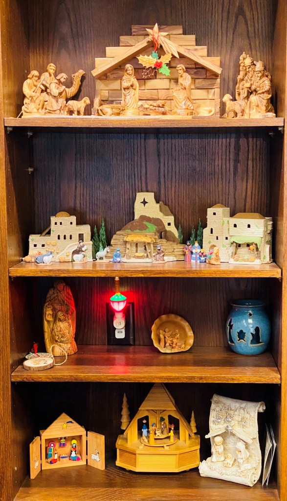 Eight Nativity Sets adorn my office shelves year-round. Each holds special meaning and memories in my life.